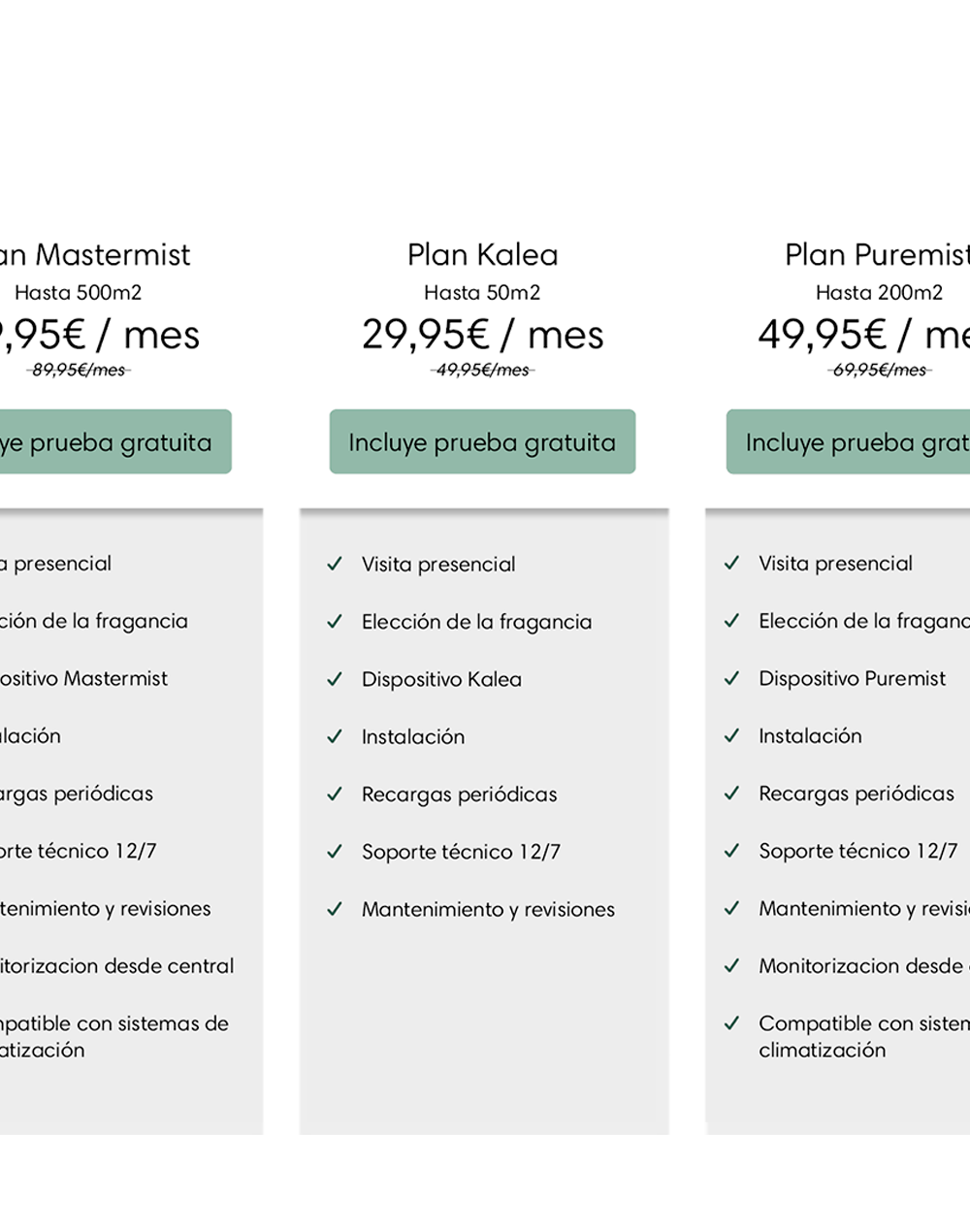 Explora nuestra gama de planes diseñados para adaptarse a las necesidades de tu negocio, todos ellos accesibles con opciones que parten desde menos 1€ AL DÍA, y garantizan una solución que se ajusta a tu presupuesto y te brinda la oportunidad de disfrutar de los beneficios de la ambientación profesional y aromatización personalizada de principio a fin para que no tengas que preocuparte por nada.