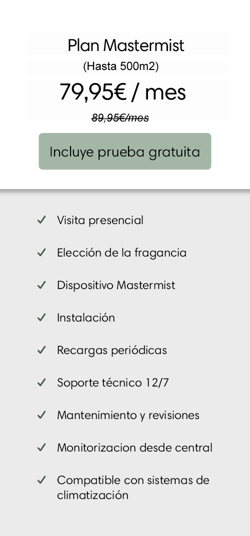 Es un servicio todo incluido, es decir, olvídate de comprar sprays, mikados, recargas, desplazamientos, periodos de tiempo sin tener tu espacio aromatizado o sustos en los gastos. No necesitas hacer un desembolso inicial en el dispositivo ni comprar grandes cantidades de aromas. Tu mensualidad incluye el alquiler del equipo profesional de nebulización, las recargas, la instalación, el soporte técnico y todo lo que tenga que ver con la ambientación profesional de tu espacio, de una manera económica y accesible.