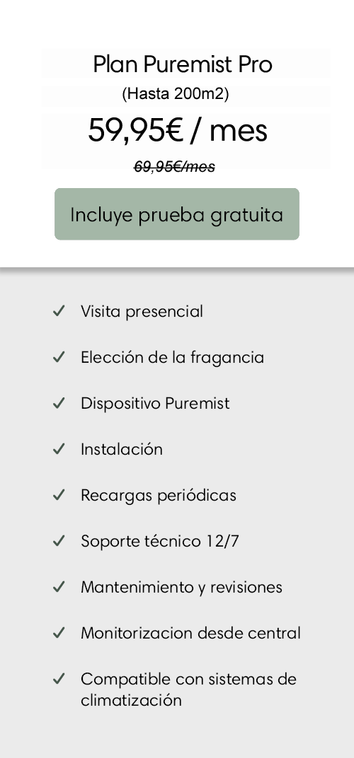 Estos Planes incluyen la visita presencial de un asesor para el estudio de tu espacio, la elección y cata del aroma que tu negocio necesita, la instalación, la recarga periódica de los aromas, los mantenimientos, incluyendo